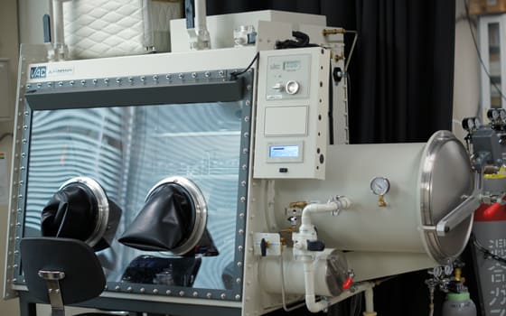 Glovebox system equipped with integrated gas purifier and automated catalyst regeneration function (VAC, OMNI-LAB) where the oxygen and moisture concentrations inside are maintained to be below 1 ppm.