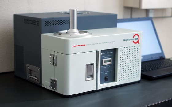 A spectrometer used to determine absolute photoluminescence quantum yield for both liquid and solid state samples using an integrating sphere and thermoelectrically cooled CCD array detector (Hamamatsu Photonics, Quantaurus-QY).