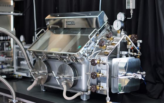 Vacuum-type glovebox system used to prepare samples under inert-gas atmosphere (UNICO, UN-650F). A high vacuum chamber is installed inside this glovebox, and in the chamber samples are degassed using a turbo-molecular pump unit.