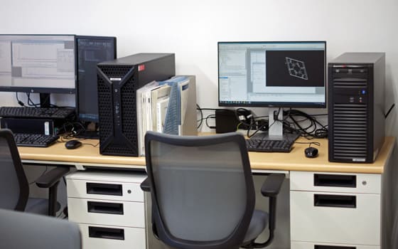 A microscope for observing structures and shapes in the nanometer-scale range below the wavelength of light. This SEM, a new model released in 2024, has an excellent user interface that allows intuitive image observation and setting changes. The microscope is equipped with a 5-axis motor-driven sample stage and a four-segment semiconductor detector for reflected electron imaging, in addition to conventional secondary electron imaging. (JEOL, JSM-IT210).