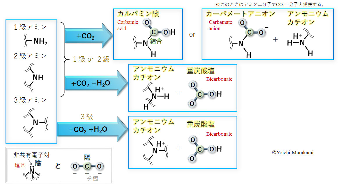 現行技術は、アミン分子(一級アミンは-NH2)の水溶液を用いる化学吸収法(環境省資料 p.7)です。CO2分子は、溶質のアミン分子と反応し、捕獲されます。次に、CO2を脱離させるとき(再生工程)に、CO2とアミン分子との間に形成された化学結合を切るために、熱エネルギーの投入が必要になります。しかしこれだけでは済まず、液重量の大半を占める脇役の「水」をも加熱し(顕熱)、それが蒸発し水蒸気になる(潜熱)際の熱エネルギーをも投入する必要があることから、大量の熱エネルギー投入が必要になる点が、現行技術の問題点です。現在吸収液の改良は進んでいますが(COURSE50)、それは主に「アミン分子とCO2分子との間の反応熱を下げる」努力によるもので、溶媒である水の顕熱と潜熱を削減できるものではありません。反応熱を下げるアプローチには限界があり、反応速度と反応熱は相反する関係にある(COURSE50)ため、反応熱を下げすぎると、液体は気体分子の拡散が遅い媒体であるために、液とガスとの接触時間を増大させる必要が生じて経済的に許容できない設備サイズになってしまいます。