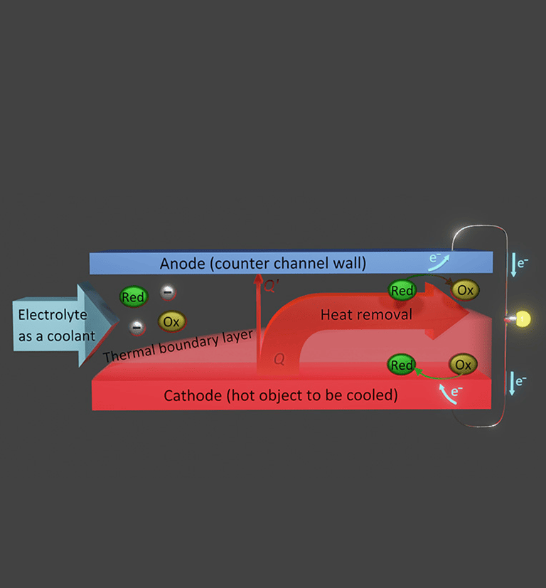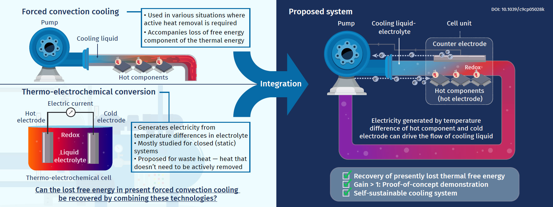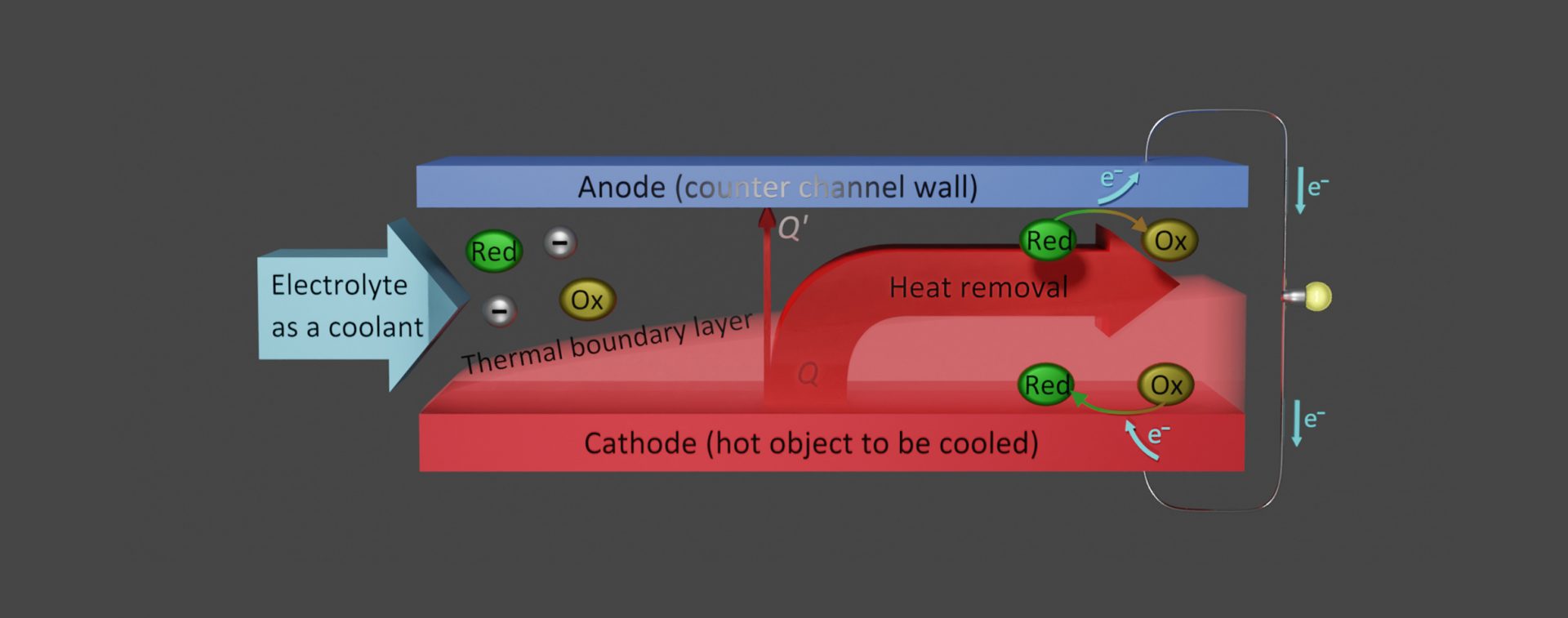 しかし、もし液体で行う熱電変換が存在し、それを強制対流冷却に組み込むことができれば、このジレンマの解決が可能と考えられます。液体は熱輸送媒体の役割も担えるため、その適用(=冷却で散逸しているエクセルギーを電力として一部回収すること)と要求満足(=除きたい熱を迅速に除き、対象を冷却すること)とが両立可能になるためです。このとき、排熱面と流動液体の界面に形成される温度境界層において大きな温度差がつくことは、短距離間に大きな温度差をつくこと(熱電発電に有利)、および、排熱面における熱伝達率が向上すること(冷却に有利)、の二重の利点につながります。一方、従来、冷却と無関係な文脈において「熱電気化学発電」という液体による熱電発電が、積極冷却の義務がない「廃熱」の再利用を目的として、閉じた静的なセルについて研究されていました。