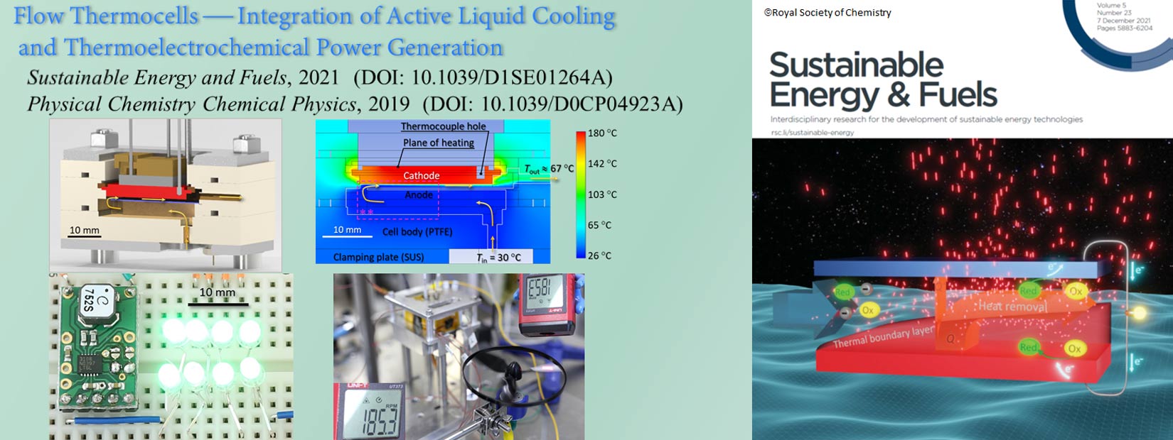 本研究室では、世界初のオリジナル技術として、熱電気化学発電を強制対流冷却に統合した「フロー熱電発電」を創出しています。(これは存在しなかった新技術なため、名前から当研究室で作りました。)すなわち「冷やしながら発電する」というコンセプトです。私達は世界に先駆けてこのコンセプトの実証と基礎特性の解明を行い(本学ニュースリリース)、さらにその性能の飛躍的な向上に成功し(本学ニュースリリース)、現在は産業界と連携して社会実装に向けた研究開発を進めています。本創出技術は、強制対流冷却に発電機能を組み込むことにより、現状未対処な「強制対流冷却に伴って生じるエクセルギー損失」への解決を与えうる新しい未利用熱の利用技術であり、社会におけるIoT圏の拡大、宇宙への人類の居住圏拡大にも組み込んでゆける、発想の根本的飛躍を伴う革新的な熱エネルギー利用技術となっています。